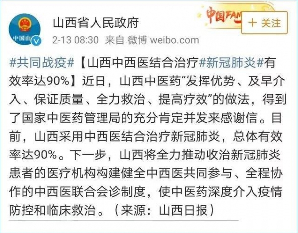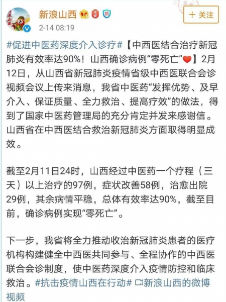 2月12日,湖北疫情防控指挥部一份文件在网络上流传。文件承认:湖北新冠肺炎患者中医药使用比例只有30.2%,远低于全国87%的水平。