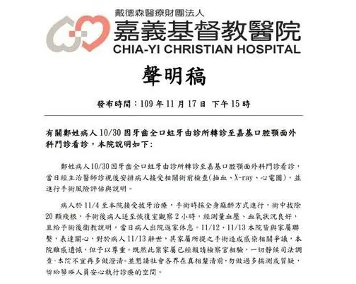嘉义基督教医院17日发表声明指出,郑姓病人10月30日因牙齿全口蛀牙由诊所转诊至嘉基口腔颚面外科门诊看诊, 当日经主治医师诊视后安排病人接受相关术前检查(抽血、X-ray、心电图),并进行手术风险评估与说明。